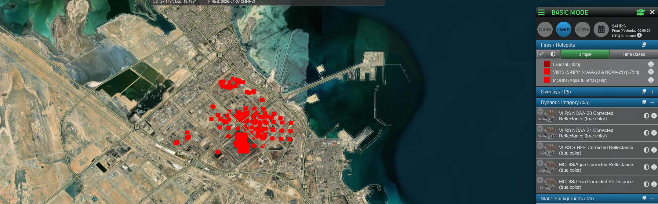 The second image, based on NASA’s FIRMS fire detection system, shows multiple active heat signatures. These are not scattered anomalies — they align directly with core production areas identified in the first image, indicating that primary processing infrastructure has been affected.