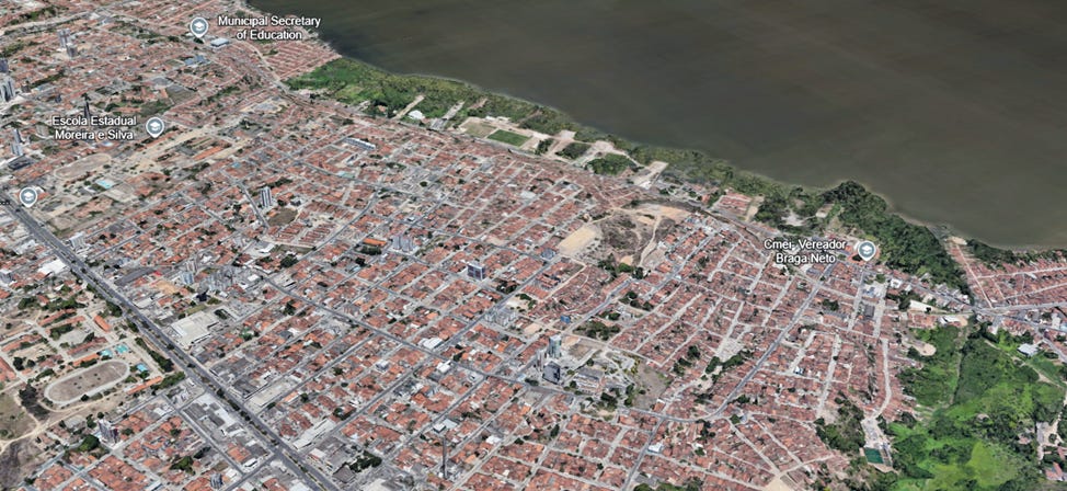 The image below shows a densely populated urban grid in Maceió, with fully developed residential neighborhoods, schools, and infrastructure located directly above Braskem’s mining areas.