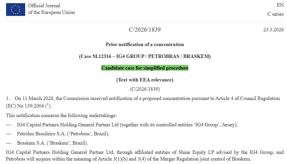 What reinforces my constructive view is the broader regulatory backdrop. The European Commission’s filing — C/2026/1839 (Case M.12316 – IG4 Group / Petrobras / Braskem) — has been classified as a candidate for simplified procedure, which typically implies limited competition concerns and a more streamlined review process.